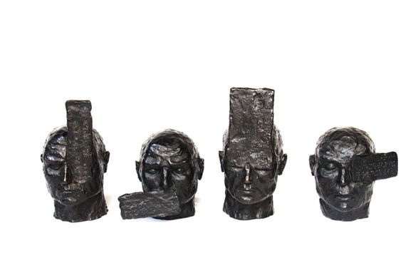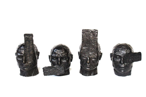 The sculptural work "Cifrados" is composed of four sculpted heads, each with embedded plates on their surfaces. These plates contain a message written in braille using the author's characteristic mirrored writing technique. However, this braille message is illegible to a blind person, adding an element of redundancy to the artwork. This redundancy reinforces the central concept that each individual sees what they want to see, even when presented with signals or messages that cannot be properly interpreted.