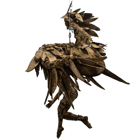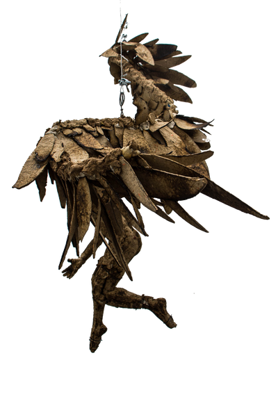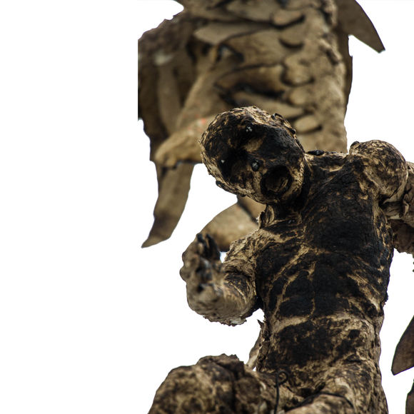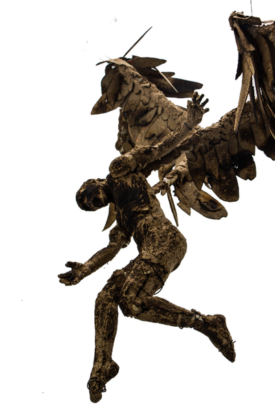 The piece is named "Echoes of Destruction." The sculpture represents a winged man symbolizing a fallen angel. Created by the artist using a mixture of burnt cardboard and binders, the material bears burn marks in certain parts of the sculpture, adding an additional layer of meaning and texture.