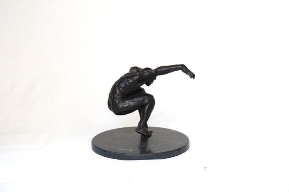 The sculpture "In Vacui" captures the moment of a man on the brink of a jump, symbolizing the inherent uncertainty humans face towards their future. The figure is depicted in a poised stance, with one foot lifted off the ground, suggesting the anticipation and hesitancy that accompanies the act of leaping into the unknown.